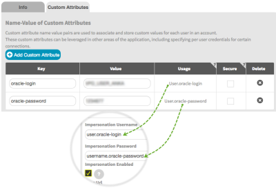 If the proxy user requires a password, select Add Custom Attribute and specify the key and value for the password. You have to specify the reference name from the Usage column in the Impersonation Password field while creating the connection.