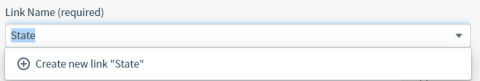 Supply a name for the cross-source link in the Link Name field. When you select the Link Name field to enter a name, a link name list appears listing all the link names that exist on other dashboards in the system. You can use this list to keep your naming consistent across dashboards. Select a name in the list or supply a new one. When you supply a new name the list shows a "Create new link ..." option which you must select to create the new link definition. In the example below, you would select Create new link "State" to create the cross-source link definition for the State field.