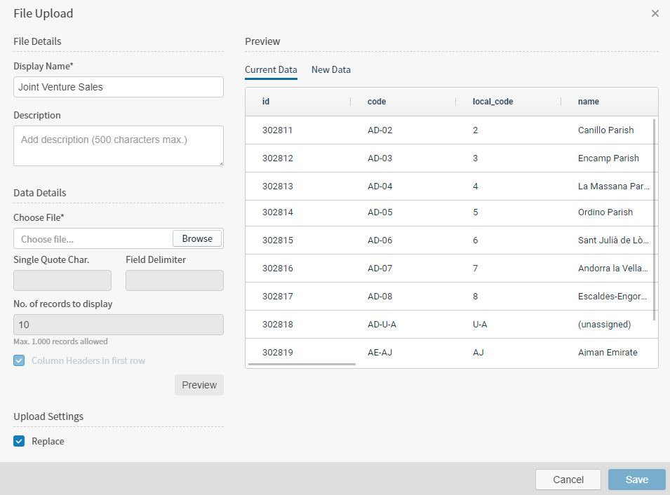 If you are replacing the existing file, your new file must use the same data file structure as the existing file. Enable the Replace checkbox in Upload Settings: previous data is replaced.