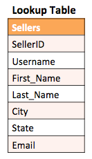 A lookup table contains description fields that describe dimensional data. For example, a lookup table may contain information about sellers that includes the seller's username, first name, last name and contact information. But this table may not contain pertinent sales data linked to the seller. This table may need to be joined with a fact table to provide more insightful information. The following is an example of a lookup table.