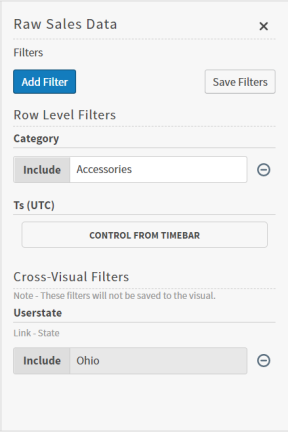 When you first access the Filters sidebar, it shows the active (applied) filters, if there are any. Cross-visual filters that have been applied from same-source and cross-source links are listed separately from filters that are applied from the Filters sidebar.