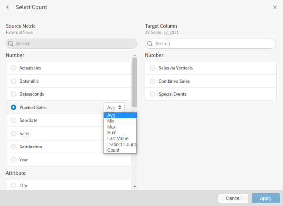 Select Add Count to open the Select Count work area. Select a source field in the Source Metric list and a Target Column to list which source field should be used, then select Apply to apply your changes.