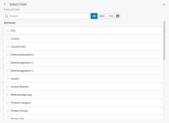 Important: Be sure that the target entity contains correct data for this materialized view. If there are more pre-aggregated group columns in the target entity than configured groups in the materialized view, the data for the query will be taken as-is from the target entity. This might result in incorrect data shown on the visual, (for example, non-unique group values and incorrect metrics).Note: Materialized views only work if you specify the metrics and groups used by your visuals in the materialized view definition. For example, if you use Sales (SUM) as your metric and State as your group in a visual, be sure to add these metrics and groups to your materialized view definition. If they don't match, Composer will not use the materialized view to boost your visual rendering time.The Select Group dialog appears.