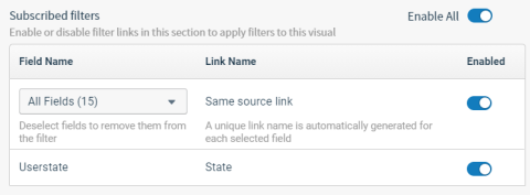 If you just want the visual to subscribe to an individual link, locate the link name in the table of Subscribed filters, and slide its corresponding switch in the Enabled on. Repeat this for every individual link to which you want the visual subscribed.