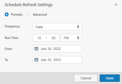 Select to enable Schedule Refresh Settings and select Periodic in the pop up. The settings work area for a periodic refresh job appear.