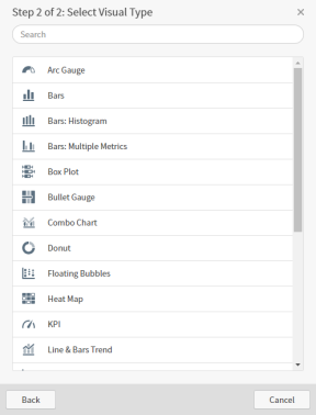 Select a visual style on the Step 2 of 2: Select Visual Type dialog. For example, select Bars. The visual is created.