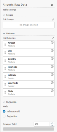 Select Infinite Scrolling to display all the data that has been fetched; view using the scroll bar. When you scroll to the bottom of the fetched data, Composer automatically fetches another block of data (based on the Rows per Fetch setting) and the additional data is also available for viewing on the visual (using the scroll bar). For example, if your Rows per Fetch setting is 250 rows, the table will initially show all 250 rows of data. When you scroll to the bottom of the data, another 250 rows of data is fetched from the data source and the table will show all 500 rows of data.