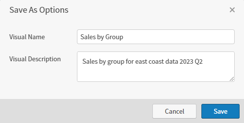 Specify a new visual name in the Visual Name box and select Save. Composer adds a copy of the visual with the new name to the visual gallery.